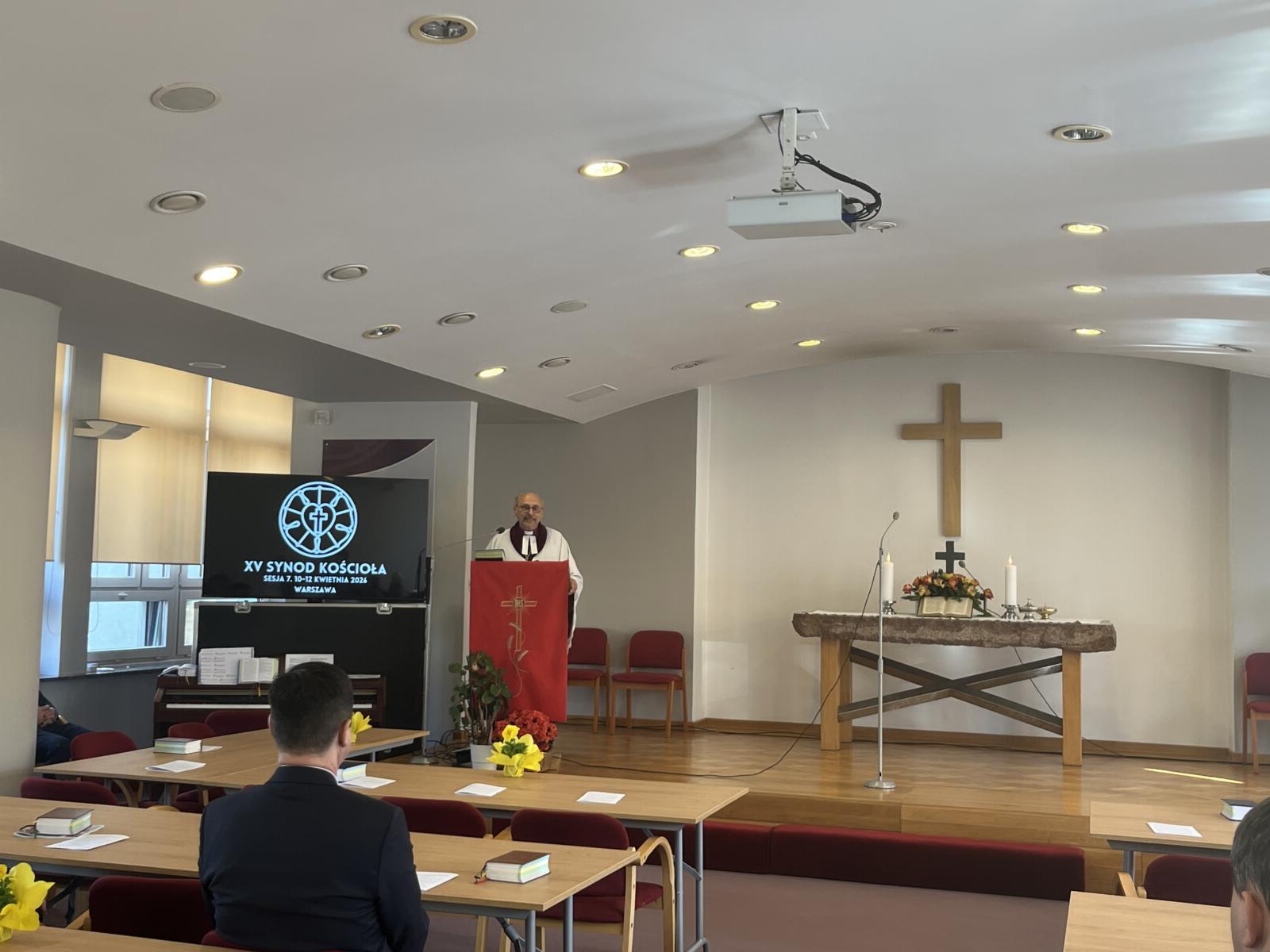 Nabożeństwo przygotowali przedstawiciele Chrześcijańskiej Akademii Teologicznej w Warszawie, a kazanie wygłosił bp prof. Adrian Korczago. W rozważaniu opartym na tekstach z Iz 55, 2b-3a i J 21, 15 wskazał na znaczenie synodu jako przestrzeni spotkania z Bogiem: „Obrady Synodu Kościoła, to nabożeństwo słuchania Boga i siebie nawzajem, to intensywne dialogowanie, energiczna rozmowa, ale w darowanych granicach bezpieczeństwa”. Synod powinien być wspólną drogą (syn-odos), w której uczestnicy słuchają Boga i siebie nawzajem, a to słuchanie nie może być powierzchowne ani deklaratywne – wymaga pokory, otwartości i gotowości do zmiany. Tak rozumiany synod jest kontynuacją nabożeństwa, a prawdziwe nabożeństwo nie kończy się w kościele, ale prowadzi do czynnej miłości wobec bliźniego. Dlatego także obrady synodu powinny owocować konkretnymi postawami, a nie jedynie dyskusją czy „polityką kościelną”. Zwierzchnik diecezji cieszyńskiej zwrócił uwagę, że w tej synodalnej drodze kluczowe jest również osobiste spotkanie z Bogiem i uważne słuchanie: „Nie chodzi o jakieś powierzchowne, wybiórcze słuchanie. Chcąc naprawdę spotkać Boga, trzeba wysłuchiwać Jego Słowa uważnie, z powagą i wrażliwością, która nie pozwala pozostać obojętnym.” Podkreślił, że tylko pokorne uznanie tej relacji pozwala właściwie przeżywać wspólnotę i odpowiedzialność za Kościół.
